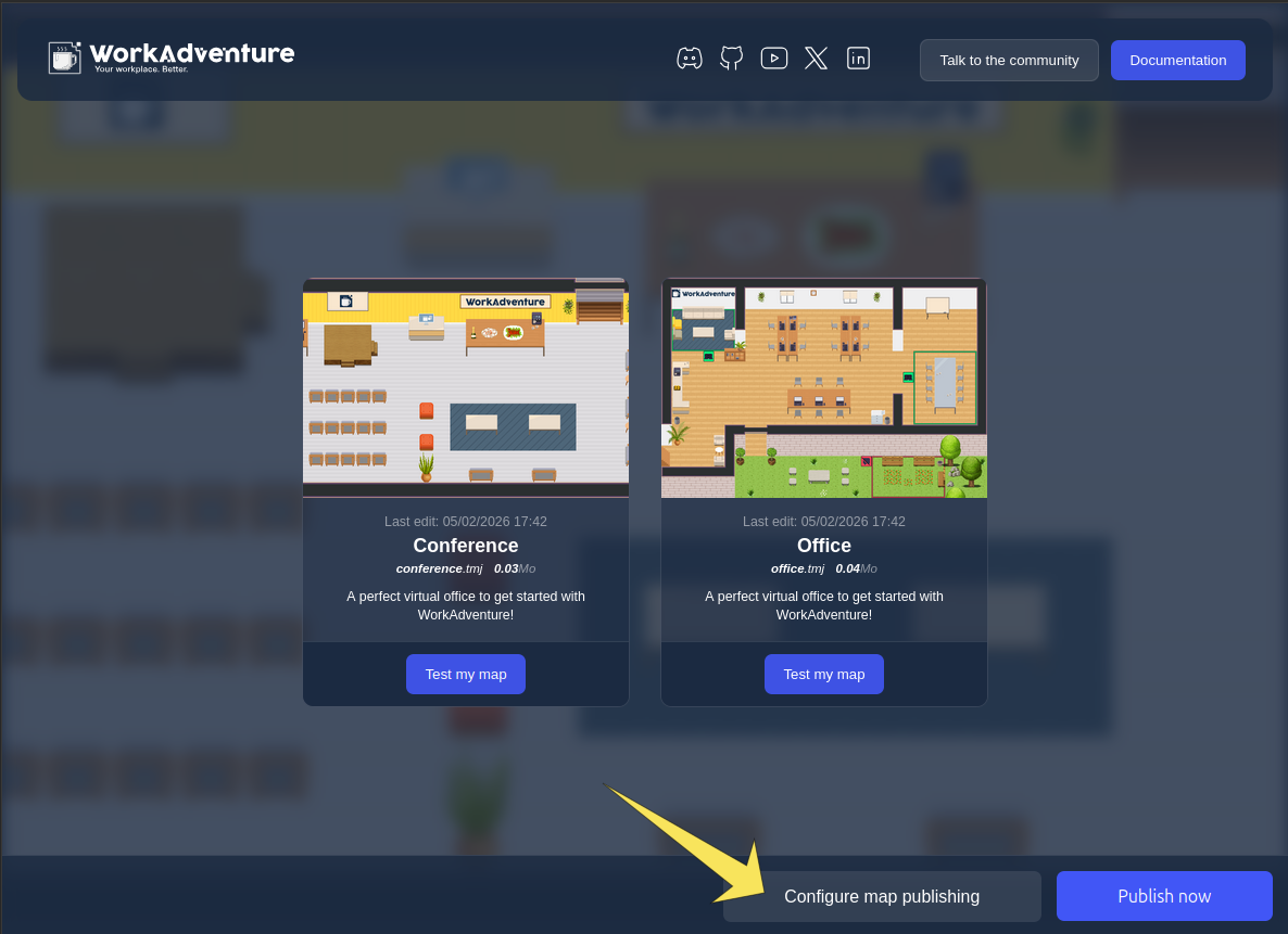 When the upload is done, you will either be redirected to the list of your maps in the admin dashboard (SaaS version), or will be shown a list of all your uploaded maps (self-hosted version). You can click on any of these maps to access them in WorkAdventure.